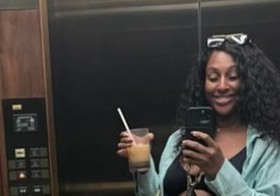 Wearing a black bikini with a green and white striped shirt as a coverup, she posed for a mirror selfie in a lift with a big smile on her face while holding an iced coffee in her other hand.