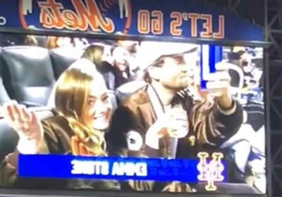 Check out this video of Emma smiling and wearing a Padres jacket on the jumbotron in the stadium. The image cuts to a man in a Mets hat, trying to whip the crowd up into a frenzy. The audience takes the bait and starts BOOING.