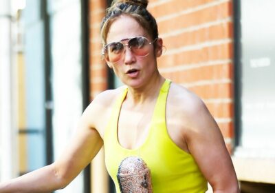 Lopez completed the look with some gold-tinted aviator sunglasses and a tight bun, and also carried a sparkly rose gold water bottle.