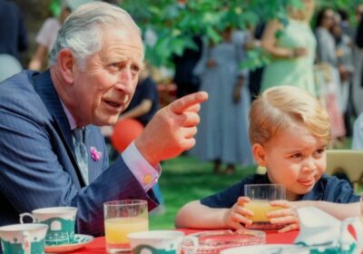 In one of the pictures, Prince Charles is seen sitting at a picnic table beside a young Prince George, who is holding a glass of juice. The little prince is wearing a navy T-shirt, while his grandfather looks sharp in a pinstripe suit and a teal tie.