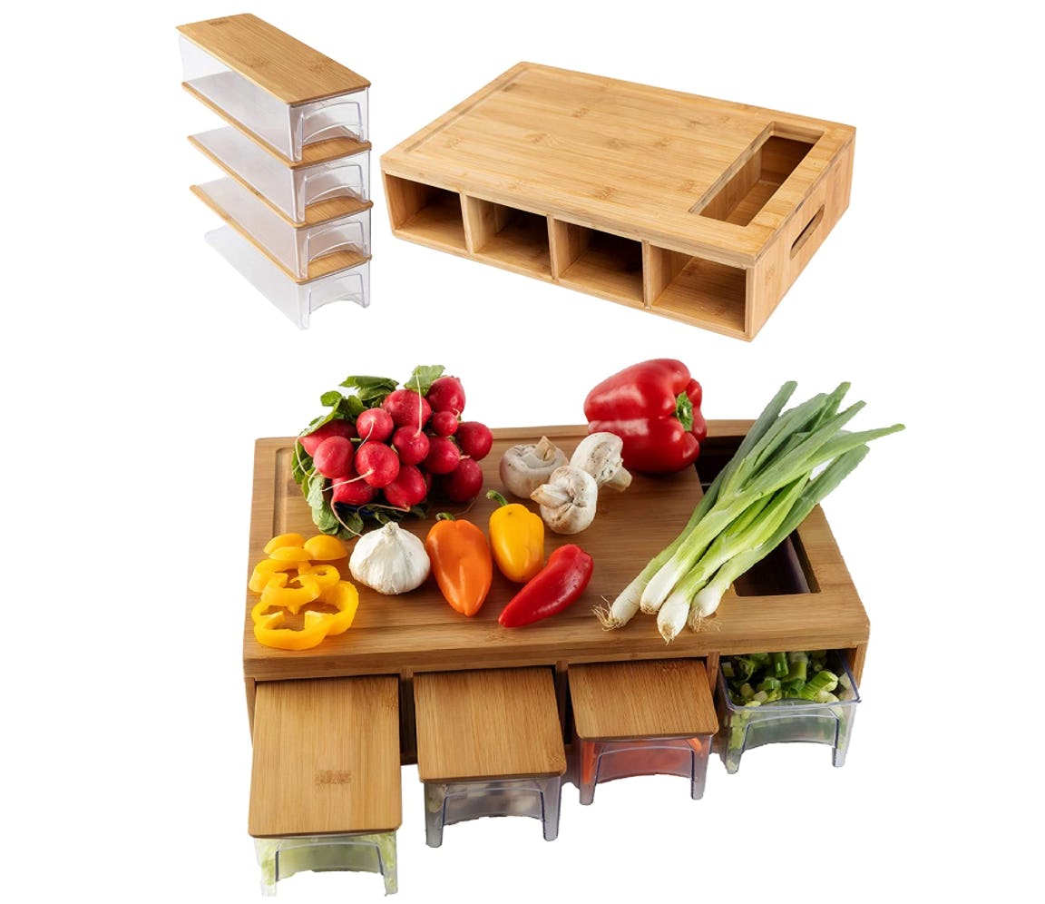 This bamboo cutting board is cleverly designed with four food storage trays for food prep, storage, and cleanup that’s exponentially easier. And it’s as easy as chopping your veggies, sliding them into the tray, and moving the trays right into the fridge. And if that weren’t enough, this cutting board is dishwasher- and microwave-safe.