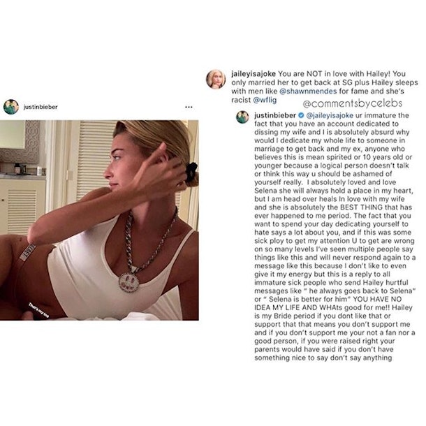 Unfortunately, Bieber and Baldwin have faced their share of criticism from Jelena fans who want to see Bieber get back together with his ex, Selena Gomez. In March 2019, Bieber decided he had had enough, and he responded to a hateful comment with a super long rant defending his marriage. “I am head over [heels] in love with my wife and she is absolutely the BEST THING that has ever happened to me period,” he wrote.