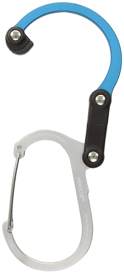 This purse hook super durable and versatile. It can hold up to 50 pounds, rotates 360-degrees, and functions as a carabiner, too. Use the hook to hang your bag from restaurant tables, changing tables, bathroom stall doors, doorknobs, or closet rods. Travel often? Use the carabiner to attach your carry-on securely to your suitcase. Avid camper? Use it to hang your backpack and supplies on a tree branch to keep everything safely away from forest creatures.