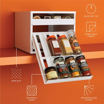This spice rack is the most clever way to save space in your kitchen cupboards. The three-tiered rack stores spice jars horizontally so they can stack on top of each other, essentially doubling your shelf space. The rack also features slide-out trays that angle down, so you can find your cumin easily, without having to look behind all the other jars. The rack holds up to 24 spice jars, and features non-slip grips on the bottom to keep it from sliding around.