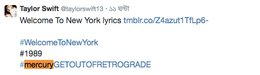 Taylor Swift, MTV.com interview, Jan. 22 2015: "When Mercury is in retrograde, basically that means that everything is going to be completely wrong and messed up and miscommunicated."
