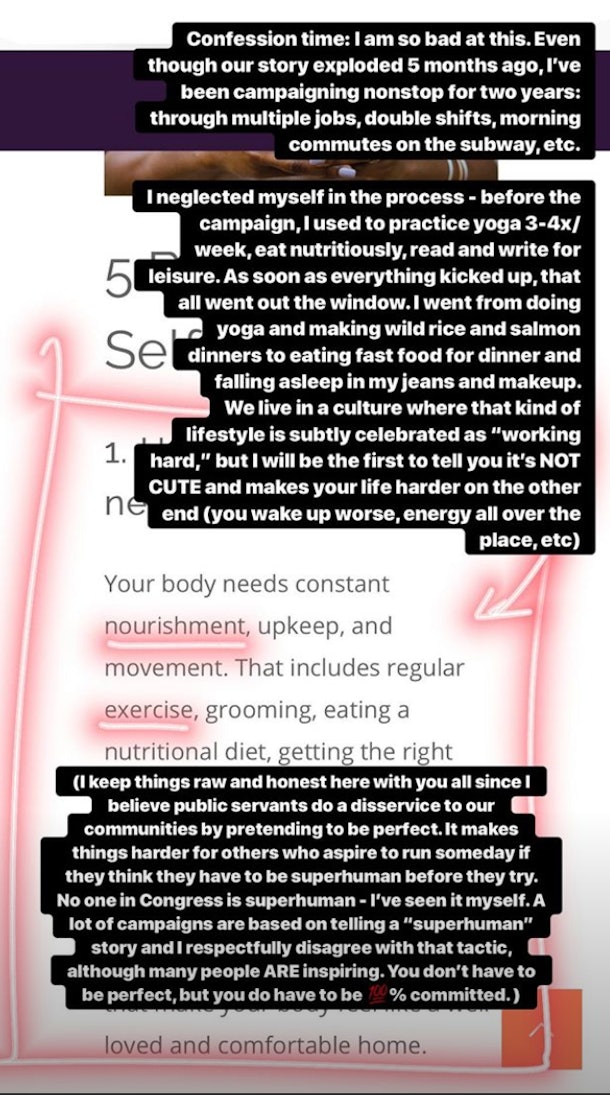 She also explained on her Instagram Story that her reason for keeping things "raw and honest" on social media is because she believes "public servants do a disservice to our communities by pretending to be perfect." For the Congresswoman-elect, she said on social media, it’s more important for her to be real with her constituents, and part of that includes recognizing that self-care can be political, and that the overall topic of self-care deserves a more nuanced conversation.