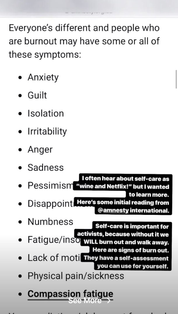 The Congresswoman-elect offered an alternative to these trendy forms of self-care by sharing an article from Amnesty International, which talked about how activists can recognize signs of burnout, since feeling totally stressed, tired, and emotionally spent can, understandably, make it pretty hard to continue engaging in your work, even when you genuinely love what you do.