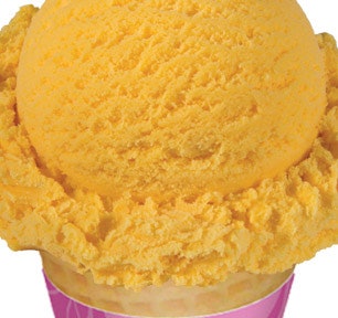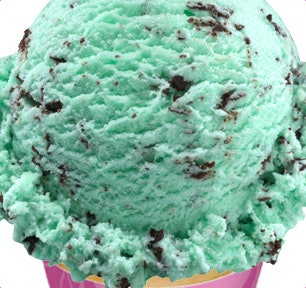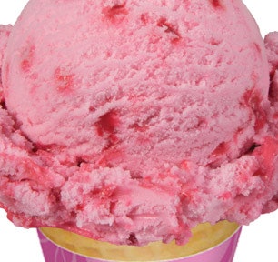 "Pink peppermint-flavored ice cream with pieces of peppermint candy."