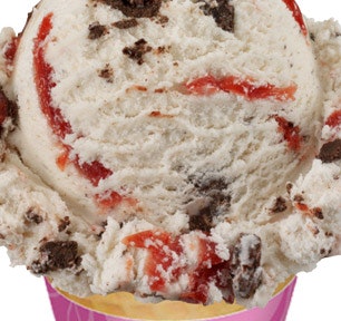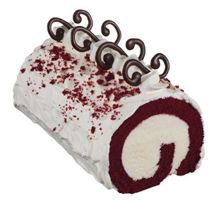 "Rich cocoa-flavored red velvet cake with delicious cream cheese-flavored ice cream … topped with traditional Red Velvet cake crumbs and festive chocolate swirls."