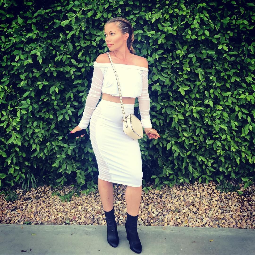 The Bachelor in Paradise alum hits up Day 1 in a denim mini skirt and boho chic blouse.
