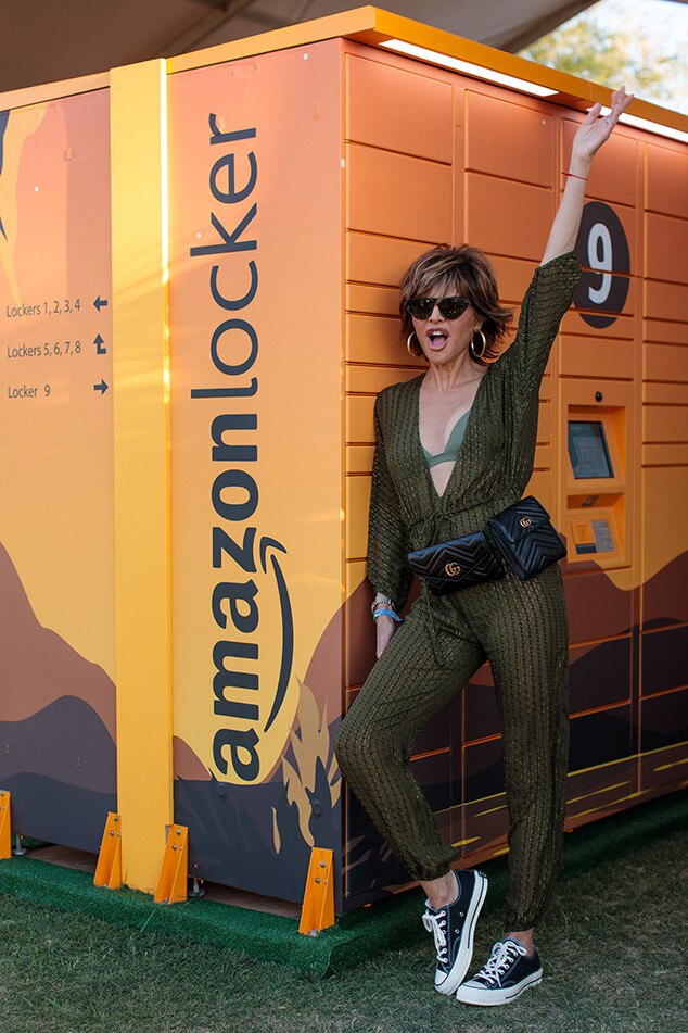 Wearing a CAMILLA dress, Child of Wild jewelry, and Frye Company shoes while carrying a Gucci backpack, the Queen of Coachella stops by the Amazon lockers to grab some festival faves.