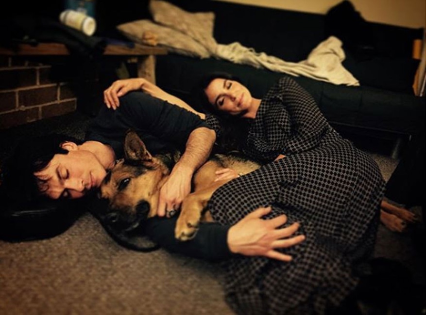 Somerhalder and Reed snuggled up with their pup—and each other—on the set of Vampire Diaries.