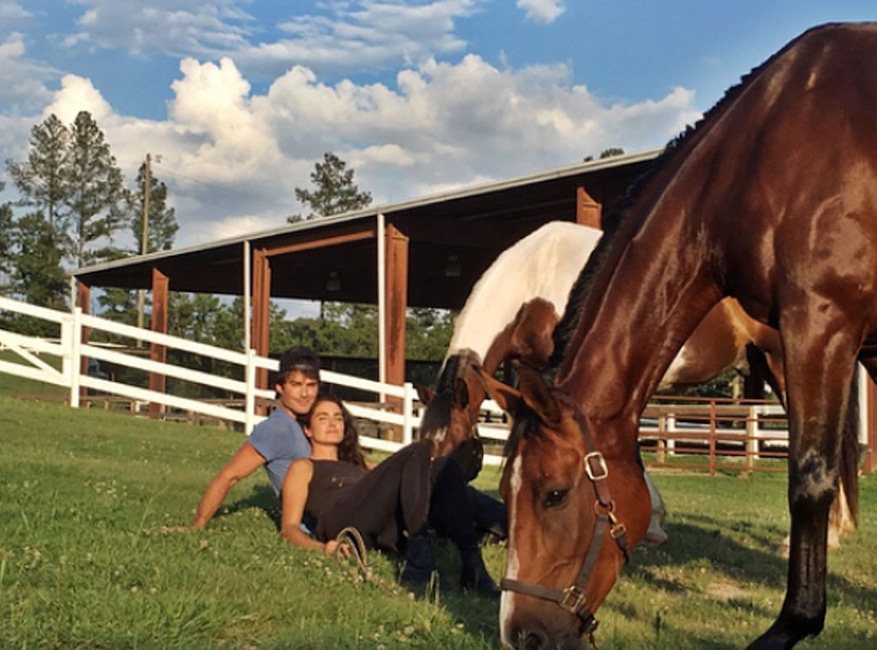 The animals lovers look so cozy laying on the grass next to some beautiful horses in this snap.