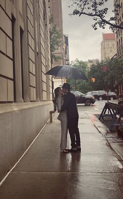 During New York Fashion Week, the cute couple shared a sweet smooch in the rain.
