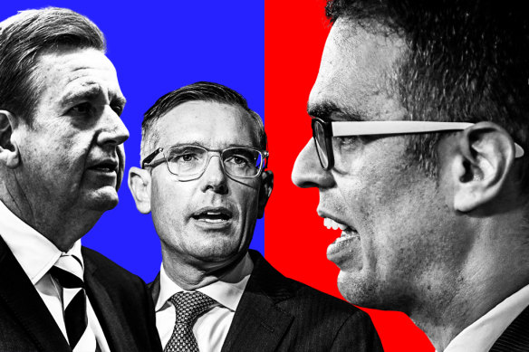 From left, Barry O’Farrell, Dominic Perrottet and Daniel Mookhey.Credit: