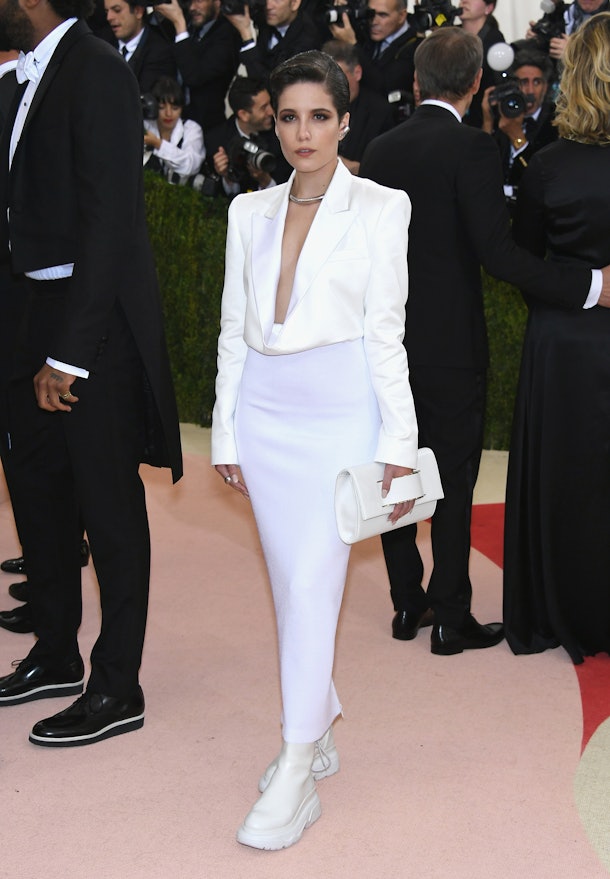 Let’s revisit what Halsey wore to the Met Gala in 2016. Though certainly gorgeous, the dress left a lot to be desired, and seeing as the Met Gala is where extreme fashion isn’t just encouraged but rather expected, it felt a little one note. The theme for that year was "Manus x Machina: Fashion in an Age of Technology" and was interpreted in a myriad of ways. Some attendees wore looks that made them look like actual robots (think metal bodices and jewelry), while others opted for ensembles crafted with innovative technologies. Halsey arrived in a white dress designed by DKNY, and aside from the metal choker around her neck and sneaker-boot hybrid footwear, nothing felt overly futuristic about it. The top half of the dress resembled a tuxedo jacket, while the bottom was a simple, form-fitted skirt. Beautiful and well-designed? Absolutely. But did it stand up to other looks on that same red carpet? Not even close.
