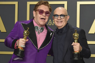 Elton John and Bernie Taupin, winners of the Oscar for best original song ‘(I’m Gonna) Love Me Again’ from film Rocketman.Credit:AP