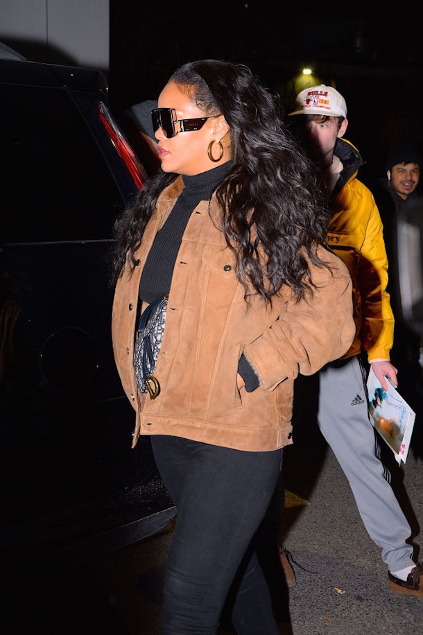 On January 15, Twitter user @RihannaNavy532 posted a photo of Rihanna heading to the show the prior night. She was wearing a coat by Vetements, a mesh bodysuit by Maison Margiela, necklaces by Jacquie Aiche, pointy toed boots by Balenciaga, and a crocodile bag by Dior. (You can see the full breakdown of the look here.) It boasted an oversized menswear appeal with a highlighter bright twist and proved once again that Riri is the queen of unexpected style.