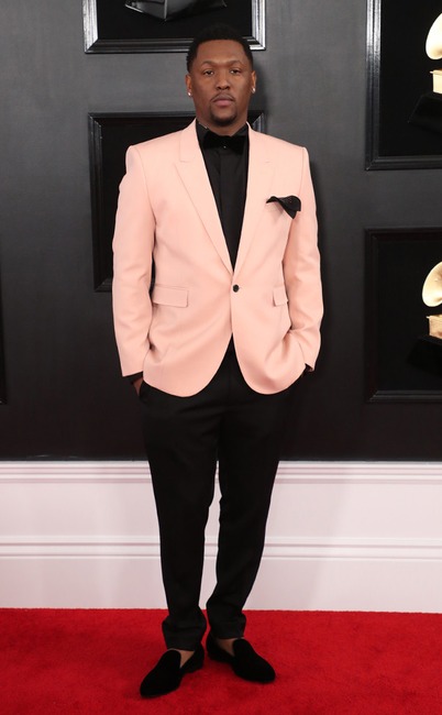 The rapper skips the basic black and white suit, and opts for a pastel pink blazer.