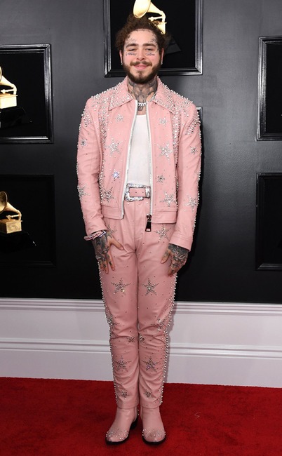 Not one to stick to the basics, Post Malone looks amazing in his all-pink, jewel-encrusted suit.
