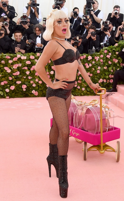 Gaga’s outfits slowly got shorter and tighter as the moments went on and she ultimately ended up in a black glittery bra and underwear combo with fishnets and those same black combat boots she wore to the pre-Met Gala dinner and back in 2016. Sure, the 33-year-old stopped the show in her outfit change-ups, but she also had on some noteworthy accessories.