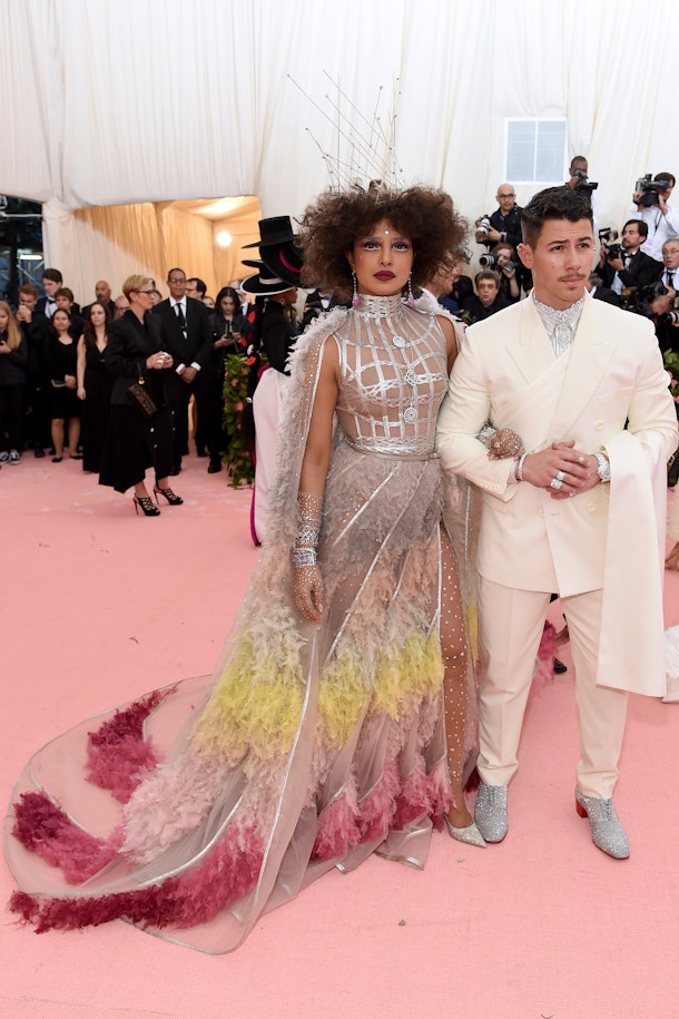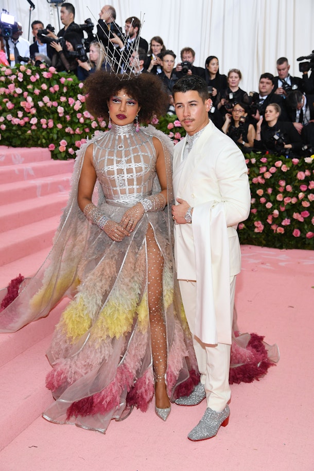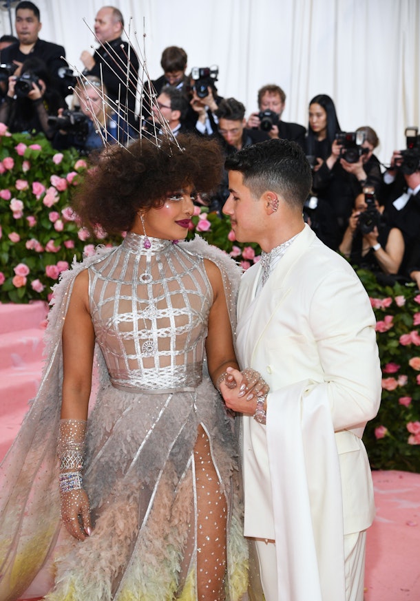 In this photo, Chopra seems much more concerned with facing the cameras than with facing Jonas, which might mean she "isn’t intent on making him a priority by facing and/or leaning in toward him as he is to her," says Woods. Again, this may not be a reflection of their relationship dynamic, but rather, that their priorities were probably about making sure their outfits got the attention they deserved. It’s the Met Gala, people!