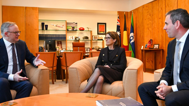 Prime Minister Anthony Albanese and Treasurer Jim Chalmers with incoming RBA governor Michele Bullock.Credit: AAP