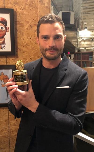 The Fifty Shades Freed star accepted his award for Worst Actor and Worst Screen Combo for his work in Fifty Shades of Grey.