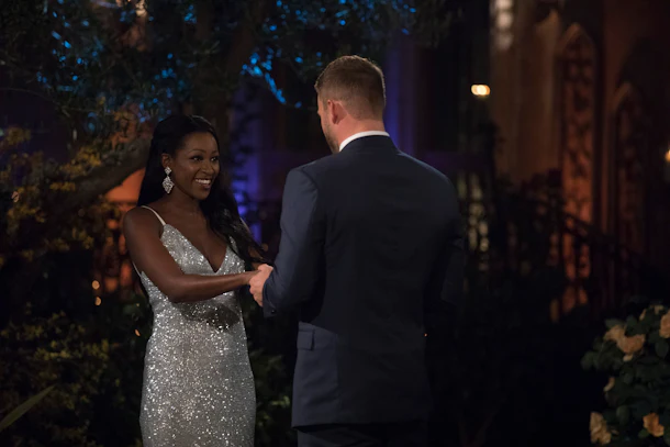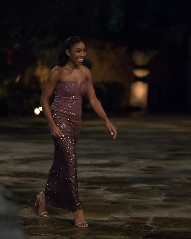 Sweet in satin, Tayshia’s glow was only exemplified by this champagne-colored, one-shoulder gown. It even looked good while she rode piggy-back on Colton!