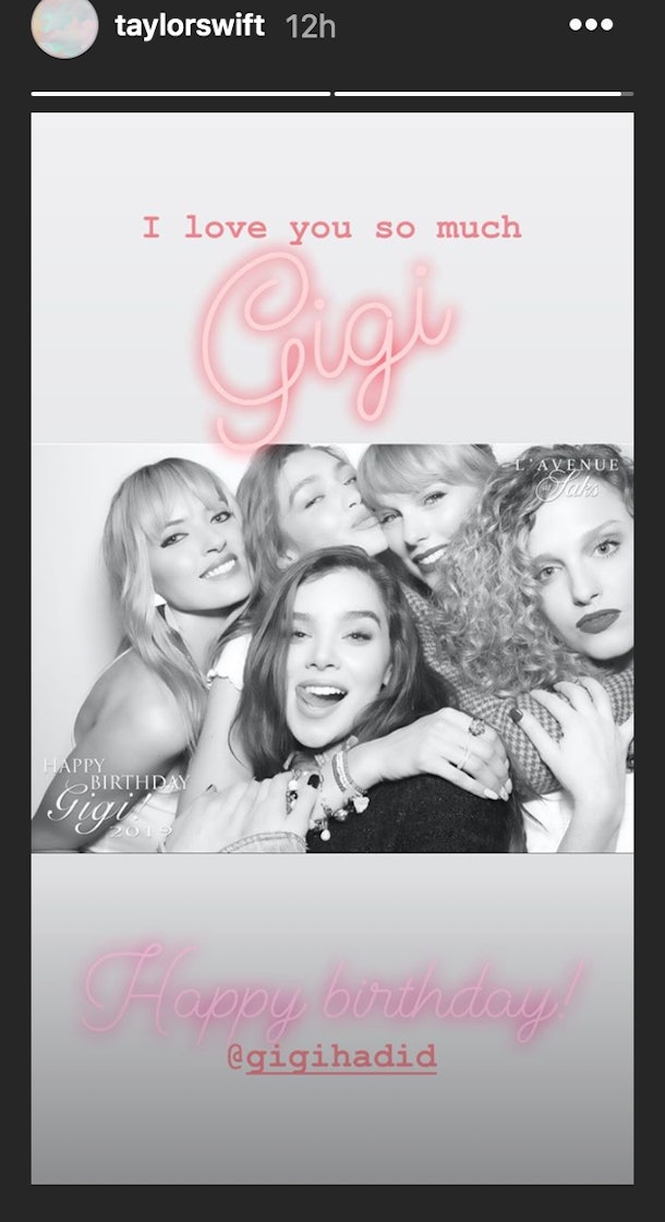 If you’re like me, you immediately pieced together part of the OG girl squad. Gigi and Steinfeld were two of the women to pop up in Taylor Swift’s army in her music video for "Bad Blood," so it’s always fun to see them back together. Swift even shared one photo booth pic on her Instagram stories with her arms wrapped around Steinfeld and Hadid along with friends Martha Hunt and Abigail Anderson. She captioned it, "I love you so much Gigi. Happy birthday!"