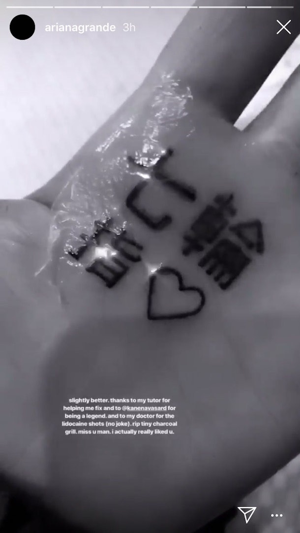 Ariana Grande no longer has a tattoo that says "BBQ grill" on her hand. Great! If you have no idea what I’m talking about, Ariana Grande recently tried to get a meaningful tattoo in Japanese kanji characters dedicated to "7 Rings" on her hand, but she misspelled it and it came out as "BBQ grill." She debuted the tattoo on her left palm earlier this week and quickly learned from her Twitter followers that what she thought was a tribute to "7 Rings" actually meant "BBQ grill." Now, after consulting with her tutor (she’s learning Japanese), she’s fixed the tattoo. The photo of Ariana Grande’s fixed "BBQ grill" tattoo still has fans split for justifiable reasons.