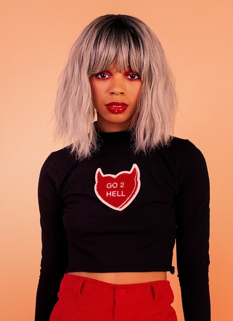 If something equally as bold but slightly less graphic is what you’re after, the collection also includes a black crop top turtleneck shirt adorned with a fuzzy patch reading, "GO 2 HELL." (Is that bold enough for you?)