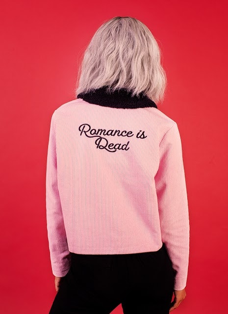 My personal favorite piece of clothing from the lineup is a baby pink corduroy jacket with a faux fur collar. Along the back in pretty black font reads, "Romance is Dead." Can you deny that you don’t feel that way from time to time, too? Regardless of your stance on romance, you can’t deny that the jacket is the perfect combination of both sassy and sweet design elements.