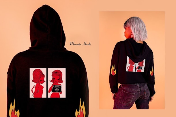 Ilse Valfré, the artist behind the eponymous brand, is to thank for the cheeky artwork that enlivens her clothing. As explained on Valfré’s website, "Her work explores the poignant tension between vulnerability and confidence as she transports her audience into the hearts and minds of the characters that she creates." One such character just so happens to be featured prominently in the new collection and it’s easy to see why. Lucy the Devil, one of the artist’s original designs (you might recognize her from a bevy of previously released products), is meant to "represent the devilish side in every girl; devious, sassy, and hotter than hell." She’s therefore the perfect babe to represent the anti-romance collection and embody the idea that girls are enough on their own and that they don’t need anyone but themselves—a fact that’s important to remember on Valentine’s Day, when being coupled up is nothing if not glorified. Featured on tees, hoodies, and long sleeve shirts alike, Lucy is the ultimate HBIC and will undoubtedly add some extra fire to your wardrobe.