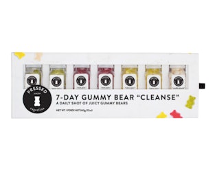 If the bears don’t win you over, the packaging will. You can buy them in a set of four shot glasses (which include the green juice, roots, citrus, and vanilla almond flavors), individual bottles, or you can purchase what might be the greatest thing you’ll ever come across: the seven-day gummy bear "cleanse." In my 30 trips around the sun, I’ve been waiting for a cleanse that involves nothing but candy, and the universe finally delivered!
