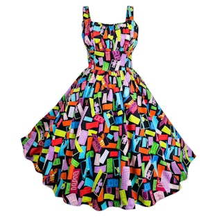 The opening of Disney Springs in 2016 brought with it the Disney Dress Shop collection — a delightful line of skirts, dresses, and other clothing items with a retro-style flare. Initially only available at the Cherry Tree Lane shop in the Marketplace Co-op, they later spread to various other locations, finally ending up at shopDisney. The designs rotate on occasion, but they all tend to have similar silhouettes; this dress features a Monsters, Inc.-inspired door print.