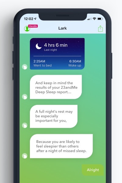 Lark is a mobile app that uses AI to help people manage chronic health conditions, including hypertension and diabetes, or simply get everyday wellness coaching. According to the news release, under this new partnership with 23andMe, you can integrate your 23andMe genetic health report into the Lark app for an even more personalized wellness experience. By combining the Lark app’s health tracking data with your 23andMe report, the company says, you’ll get more personalized recommendations for your sleep habits, reminders at key times to eat foods that fuel your specific nutritional needs, and encouragement catered to your unique activity goals.