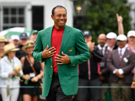 Tiger Woods celebrates with the green jacket after winning the 2019 Masters. (Photo: Michael Madrid, USA TODAY Sports)