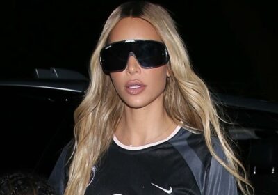 Kim wore an all-black outfit that included a graphic top that looks like sports jersey material.