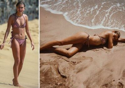 Wearing a pink and black bikini, the 5’8” model beamed as she basked in the sunshine.