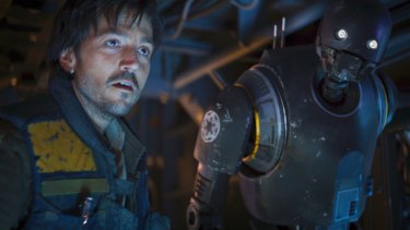 Rebel pilot Cassian Andor (Diego Luna) and droid K-2SO (Alan Tudyk) in Rogue One.Credit:Lucasfilm