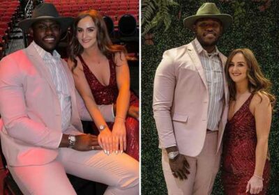 She wore a form-fitting red low cut dress with her long brunette hair in waves, while her beau sported a pink suit, white sneakers, and a wide-brimmed hat for the occasion.