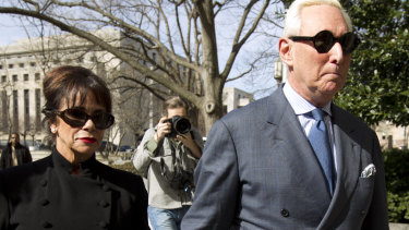 Former campaign adviser for President Donald Trump, Roger Stone accompanied by his wife Nydia Stone, left, arrives at federal court in Washington.Credit:AP
