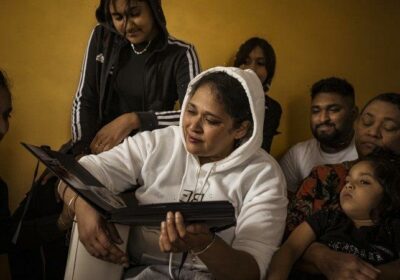 Jasmin Hussein weeps as she and her family (Eiliya, Grandma Rita, Zaahir, Imani, Aleena and Ammara) look through a photo album containing photographs of her deceased 14-year-old daughter Alisha.Credit:Chris Hopkins