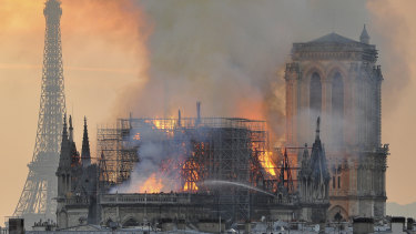 Flames and smoke rise from the burning Notre Dame on Monday night. Credit:AP
