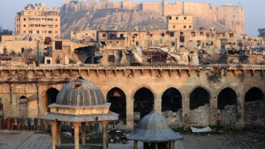 Tthe Aleppo citadel, in the background, and the heavily damaged Grand Umayyad mosque in the old city of Aleppo, Syria, Credit:AP
