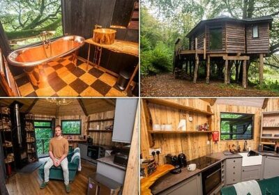 John Kitson, 42, built the luxurious one bed ‘Cornish Treehouse’ property in a secluded woodland in Morval, near Looe – a modern elevated wooden structure with WiFi available from £195 a night.