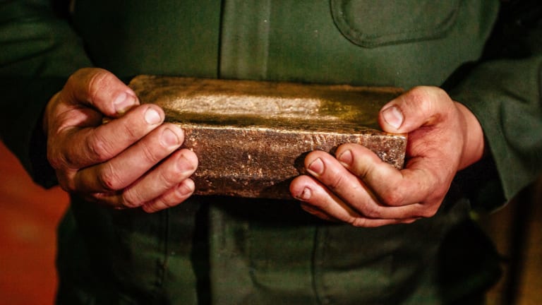 A worker carries a 28 kilogram gold bar.Credit:Bloomberg