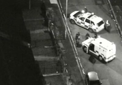 The video shows armed cops pulling up at a terraced home at night as they make their way to the front door.