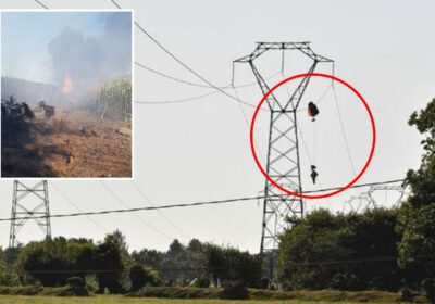 Fighter pilot trapped on high-voltage power lines by his parachute after F-16 jet crashes in France – The Sun